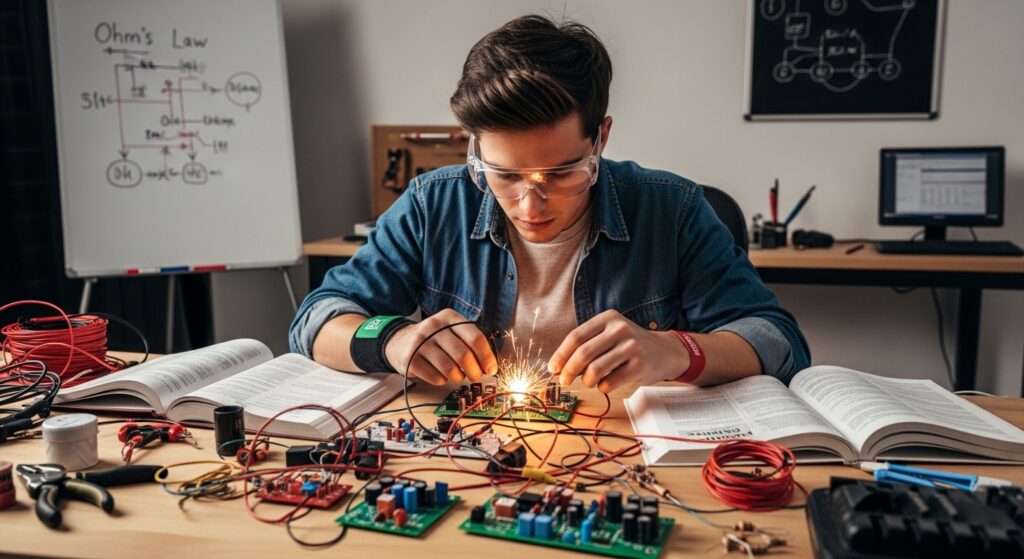 Aquí aprendes conceptos básicos como voltaje, corriente, resistencia y potencia. La Ley de Ohm es el punto de partida, junto con el entendimiento de circuitos básicos. Sin esta base, es imposible avanzar.